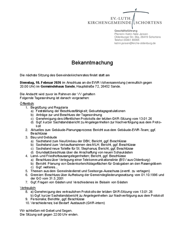 Die nächste Sitzung des Gemeindekirchenrates findet am Dienstag, 10.2.2026, gegen 20 Uhr im Gemeindehaus Sande, Hauptstraße 72, statt. Zuvor kommen die Gemeindekirchenräte aus allen vier Gemeinden der Region Friesland-Mitte dort zu einer Vollversammlung zusammen.