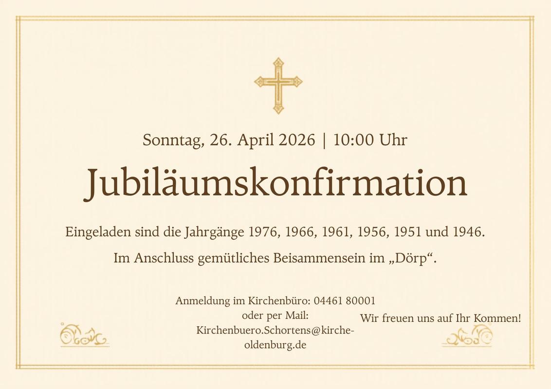 Am Sonntag, den 26. April, lädt die Ev.-luth. Kirchengemeinde Schortens ein zur Feier der Konfirmationsjubiläen ab der Goldenen Konfirmation. Eingeladen sind alle Konfirmandinnen und Konfirmanden der Jahrgänge 1976, 1966, 1961, 1956, 1951 und 1946.