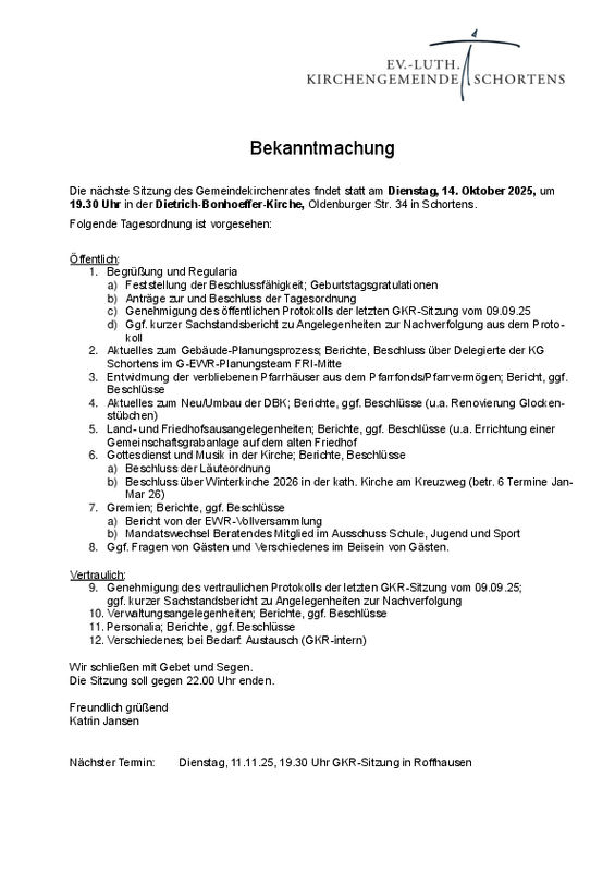 Am Dienstag, 14. Oktober, findet die nächste GKR-Sitzung statt - ausnahmsweise im Gemeinderaum in der Dietrich-Bonhoeffer-Kirche, Oldenburger Str. 34. Wir beginnen um 19:30 Uhr. Der erste Teil der Sitzung ist öffentlich.